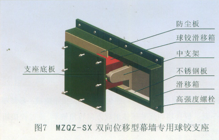 支座結(jié)構(gòu)如圖7。其主要由支座底板、球鉸滑移箱、中支架、不銹鋼板、滑移箱、防塵板和高強度連接螺栓組成。球鉸滑移箱內(nèi)部采用萬向轉(zhuǎn)角軸承,軸承內(nèi)圈與中支架之間采用簡支梁形式的銷軸連接。軸承內(nèi)、外圈的相對轉(zhuǎn)動實現(xiàn)支座的萬向轉(zhuǎn)角功能。此類支座中軸承內(nèi)圈與銷軸有兩種配合形式:1、軸承內(nèi)圈與銷軸之間采用間隙配合,其相對滑動實現(xiàn)較小位移,與銷軸軸線垂直方向的位移是通過軸承座與球鉸滑移箱箱體之間的不銹鋼板和聚四氟乙烯滑板之間的滑動實現(xiàn),支座的橫軸向位移均是在球鉸滑移箱內(nèi)實現(xiàn),可大大減小與主體結(jié)構(gòu)的配合尺寸;2、軸承內(nèi)圈與銷軸之間采用過盈配合,銷軸與軸承內(nèi)圈相對固定,通過滑移箱與中支架之間的不銹鋼板和聚四氟乙烯滑板的相對滑動來實現(xiàn)軸向位移。與之垂直方向的位移是通過軸承外圈所套方形軸承座與箱體間的不銹鋼板和聚四氟乙烯滑板的相對滑動實現(xiàn)。