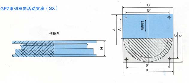 性能及分類 a 、雙向活動(dòng)支座:具有豎向轉(zhuǎn)動(dòng)和縱向與橫向滑移性能,代號為SX 。 b、單向活動(dòng)支座:具有豎向轉(zhuǎn)動(dòng)和單一方向滑移性能,代號為DX 。 c、固定支座:僅具有豎向轉(zhuǎn)動(dòng)性能,代號為GD。