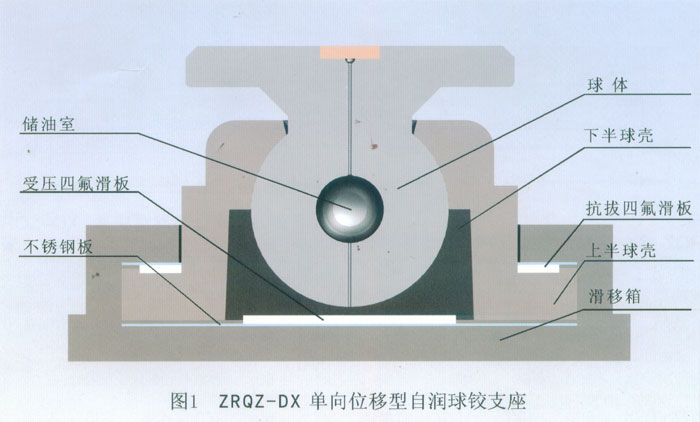 此類支座分為固定型、單向位移型和雙向位移型,支座結(jié)構(gòu)如圖1。其主要由球體、上半球殼、下半球殼、抗拔聚四氟乙烯滑板、受壓聚四氟乙烯滑板、不銹鋼板和滑移箱組成。其中球體內(nèi)部開有儲(chǔ)油室和油路,用于儲(chǔ)存和輸送潤(rùn)滑脂液,依靠裝置本身的調(diào)節(jié)功能保證接觸面始終處于潤(rùn)滑狀態(tài),所用潤(rùn)滑脂液為耐高溫?zé)o揮發(fā)的綠色材質(zhì)。本類支座可通過(guò)球體.與上、下半球殼之間的轉(zhuǎn)動(dòng)實(shí)現(xiàn)較大轉(zhuǎn)角(常用值為0.02~O.lOrad),在工作過(guò)程中支座沿著滑移箱滑道滑動(dòng)實(shí)現(xiàn)水平位移。