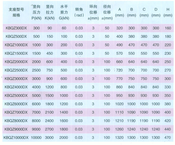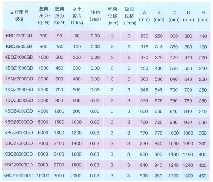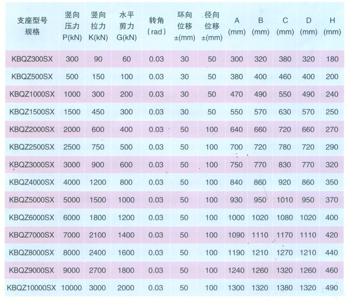 4 KBQZ系列抗拔球型支座 本系列支座主要分為抗拔球型支座和減震抗拔球型支座,下面對其進行分類介紹。4.1抗拔球型支座 此類支座分為固定型、單向位移型和雙向位移型,支座結構如圖3。其主要由支座頂板、不銹鋼板、平面聚四氟乙烯滑板、球冠襯板、球面聚四氟乙烯滑板、中支架、聚四氟乙烯滑板、不銹鋼板和滑移箱組成。支座中的相對滑移部件之間,采用目前世界上摩擦系數(shù)最低的聚四氟乙烯滑板和不銹鋼板相隔,充分減小了摩擦阻力,使各部分之間的運動流暢,避免爬行現(xiàn)象的產(chǎn)生。本類支座通過球面聚四氟乙烯滑板上部構件沿著球面相對于下部構件的轉(zhuǎn)動實現(xiàn)轉(zhuǎn)角(常用值為0.02rad),在工作過程中支座沿著滑移箱滑道滑動實現(xiàn)水平位移。 豎向壓力的傳遞是通過支座頂板,不銹鋼板,平面聚四氟乙烯滑板,球冠襯板,球面聚四氟乙烯滑板,中支架,聚四氟乙烯滑板,不銹鋼板依次疊加傳至滑移箱底板。 豎向拔力的傳遞是通過支座頂板和中支架的抗拔接觸面將作用于支座頂板上的上.拔力傳至中支架,再由中支架與滑移箱之間的抗拔四氟滑板和不銹鋼板將力傳至滑移箱頂板。 水平力的傳遞是通過支座頂板側(cè)壁與中支架側(cè)壁之間.的接觸面將水平力傳至中支架,再由中支架與滑移箱的接觸面?zhèn)髦粱葡鋫?cè)壁根部。 固定型抗拔球型支座不設滑移箱。4.1.1普通抗拔雙向位移型球型支座KBQZ-SX普通抗拔雙向位移型球型支座參數(shù)表 表74.1.2普通抗拔單向位移型球型支座KBQZ-DX普通抗拔單向位移型球型支座參數(shù)表 表84.1.3普通抗拔固定型球型支座KBQZ-GD普通抗拔固定型球型支座選用參數(shù)表 表9
