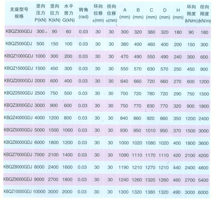 KBQZ-DXJ單向位移減震型球型支座參數(shù)表 表1 1
